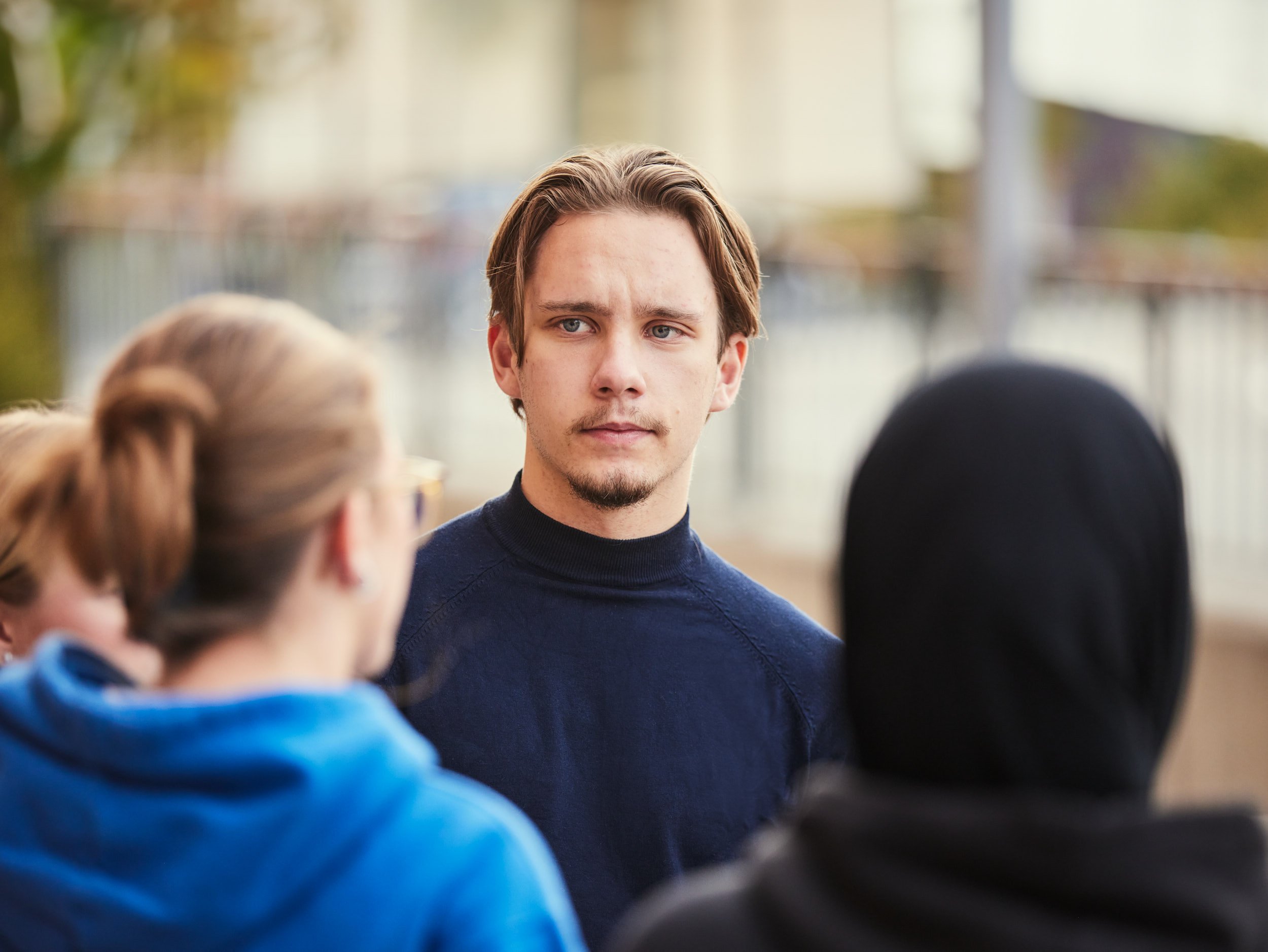Elev utomhus ser in i kameran.